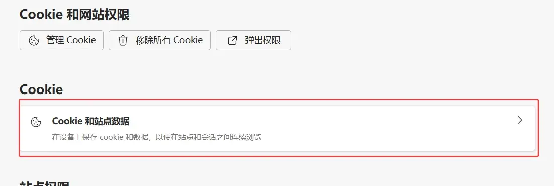 浏览器输入:edge://settings/content 直接访问特定页面。用户也可以通过 设置>Cookie与网站权限 进入此页面。