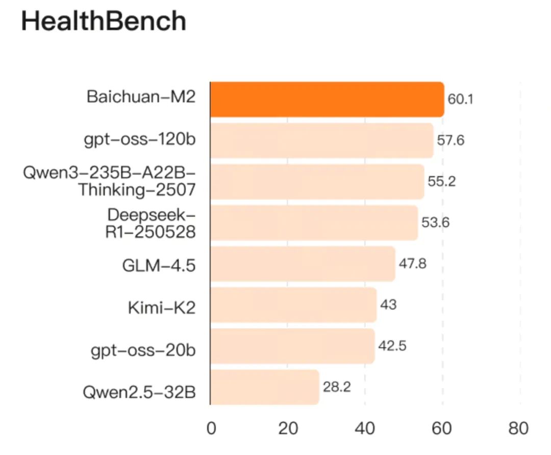 百川智能开源医疗大模型 Baichuan-M2能力全球登顶,Baichuan-M2在 HealthBench 评测中获得了60.1分,超越了 OpenAI 最新发布的 gpt-oss120b 模型(得分57.6分),并在国际上领先于 Qwen3-235B、Deepseek R1、Kimi K2等其他开源大模型。